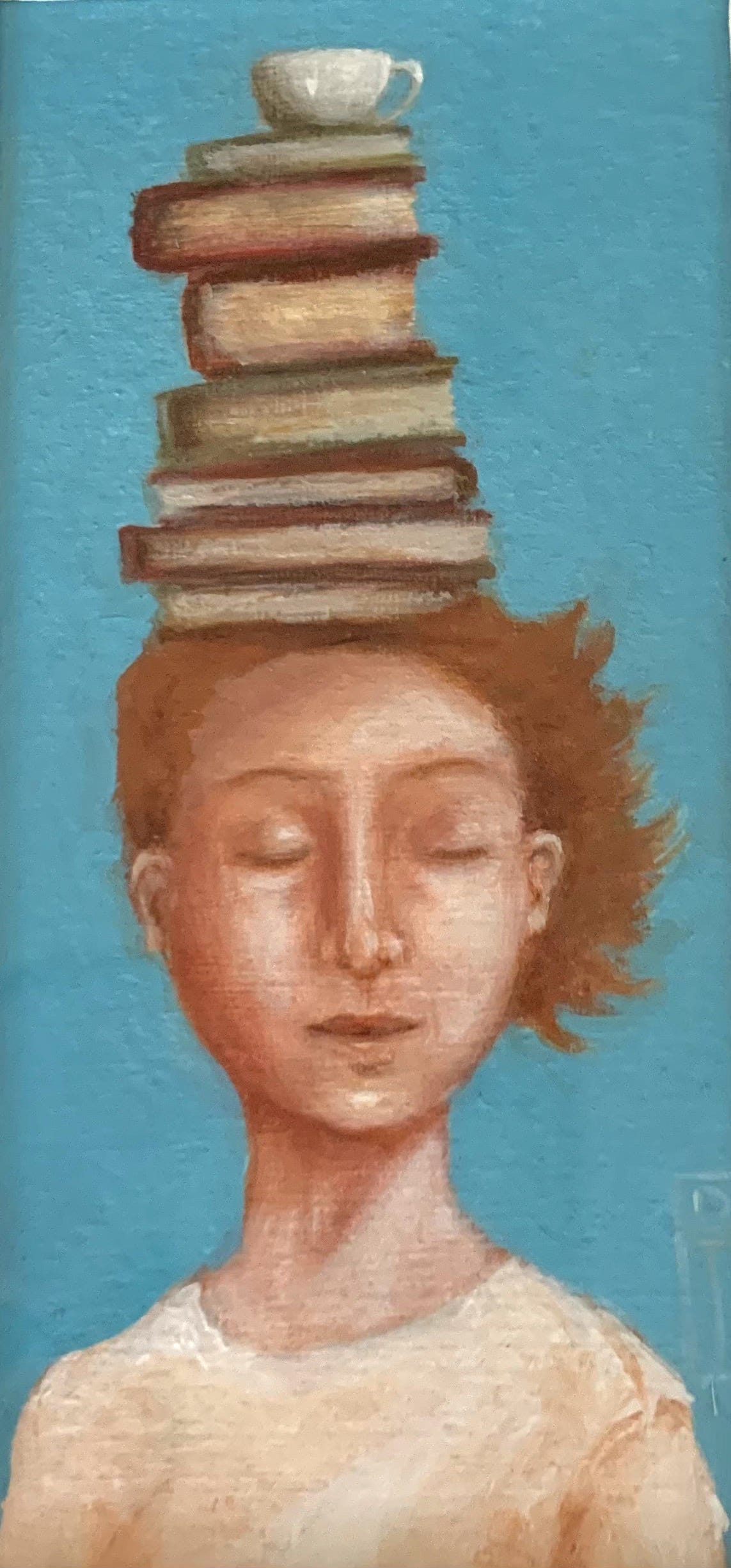 Twenty years ago, Deb Taylor gave me a painting of a red-headed woman with a stack of books on her head, a teacup precariously perched on top. More recently, another friend, Alice Smith, designed and stitched a beautiful embroidery of the cover art from Why Everything That Doesn’t Matter, Matters So Much.